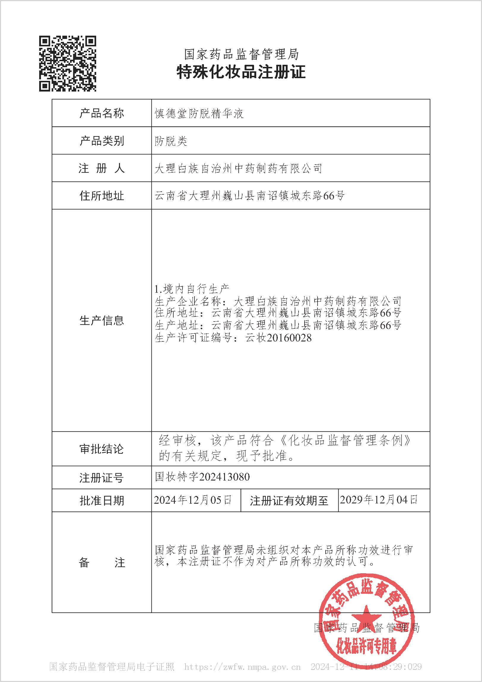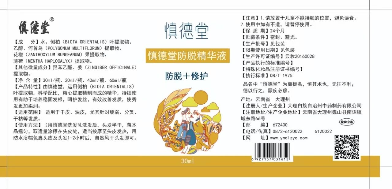 最后,再次祝贺大理白族自治州中药制药有限公司产品“慎德堂防脱精华液”取得国家药品监督管理局颁发的“特殊化妆品注册证”!