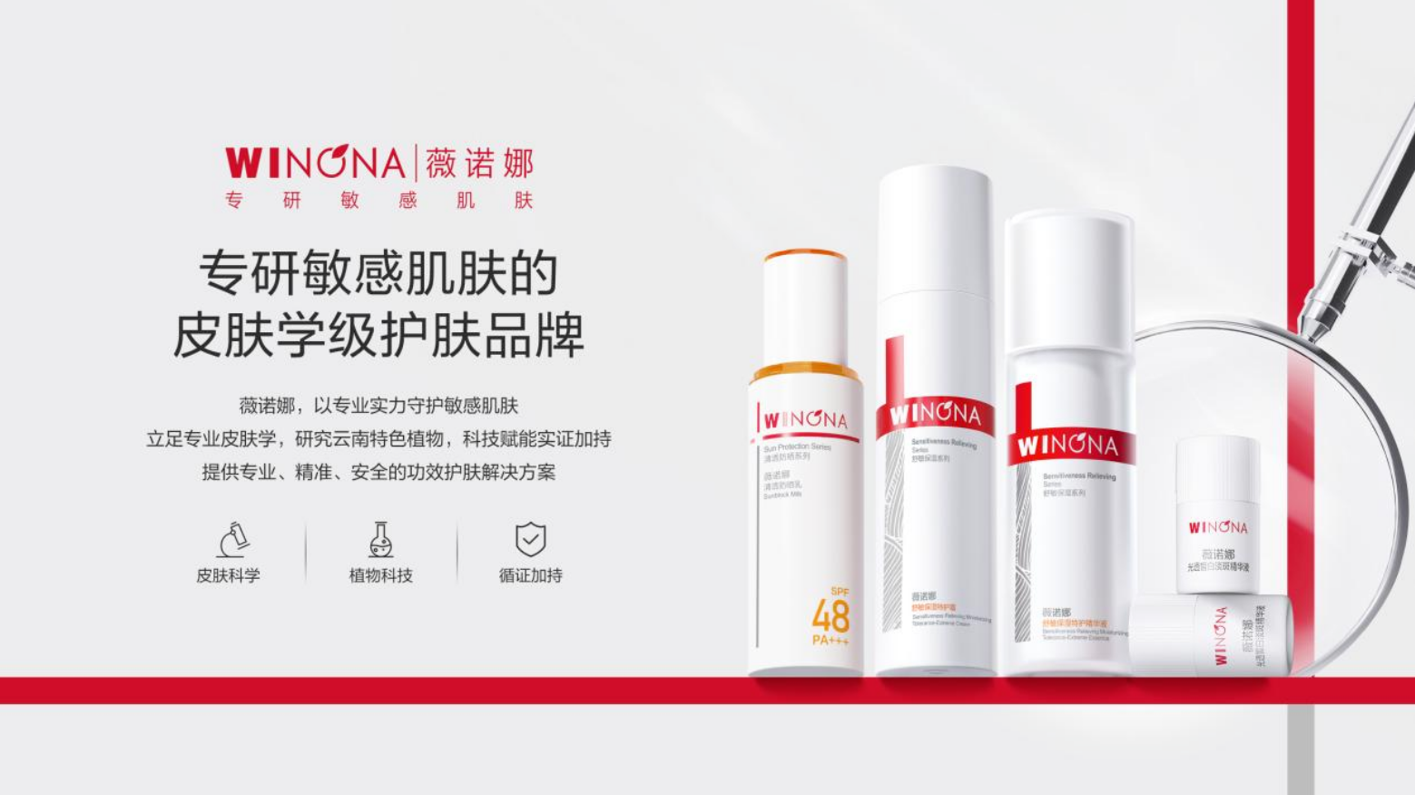 在“皮肤科学”“植物科技”“循证医学”三大品牌支柱的支持下,从治愈到守护、从专注到专研,如今进入2.0发展阶段的薇诺娜,已成功在国际品牌林立的敏感肌赛道开辟出本土品牌新疆域,并持续稳居敏感肌赛道头部地位,尽显国民品牌底色。Euromonitor统计数据显示,薇诺娜在中国皮肤学级护肤品赛道市场排名已连续多年位居第一。