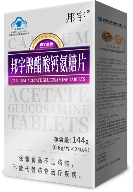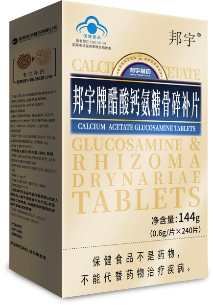 · 邦宇牌醋酸钙氨糖骨碎补片、邦宇牌醋酸钙氨糖片:针对中老年骨关节问题,通过“分方分补”科学配比,实现钙质与氨糖协同补充;