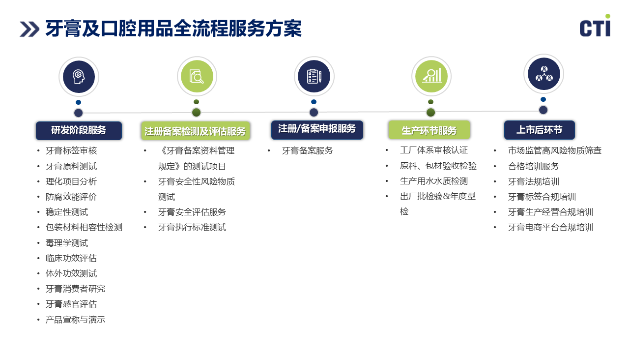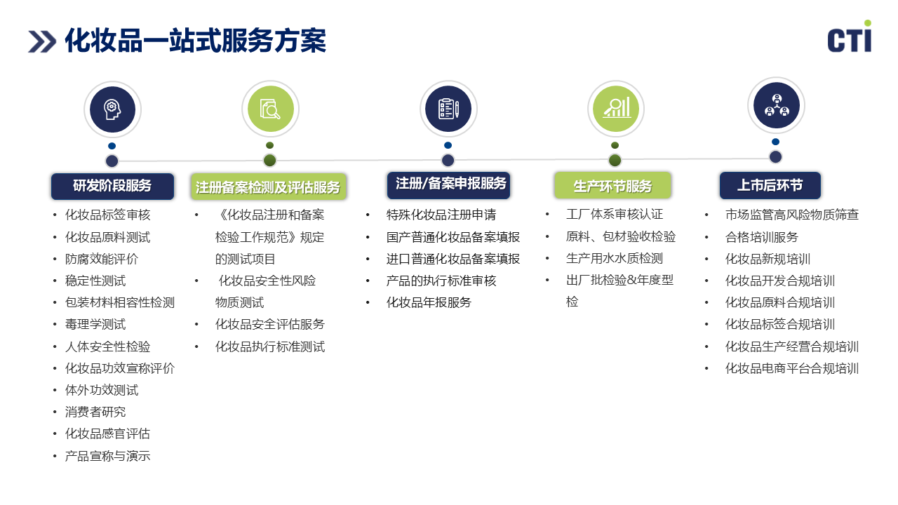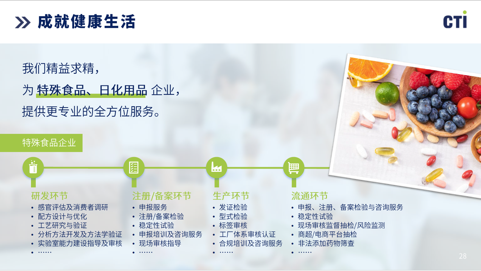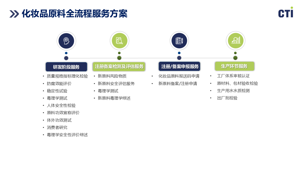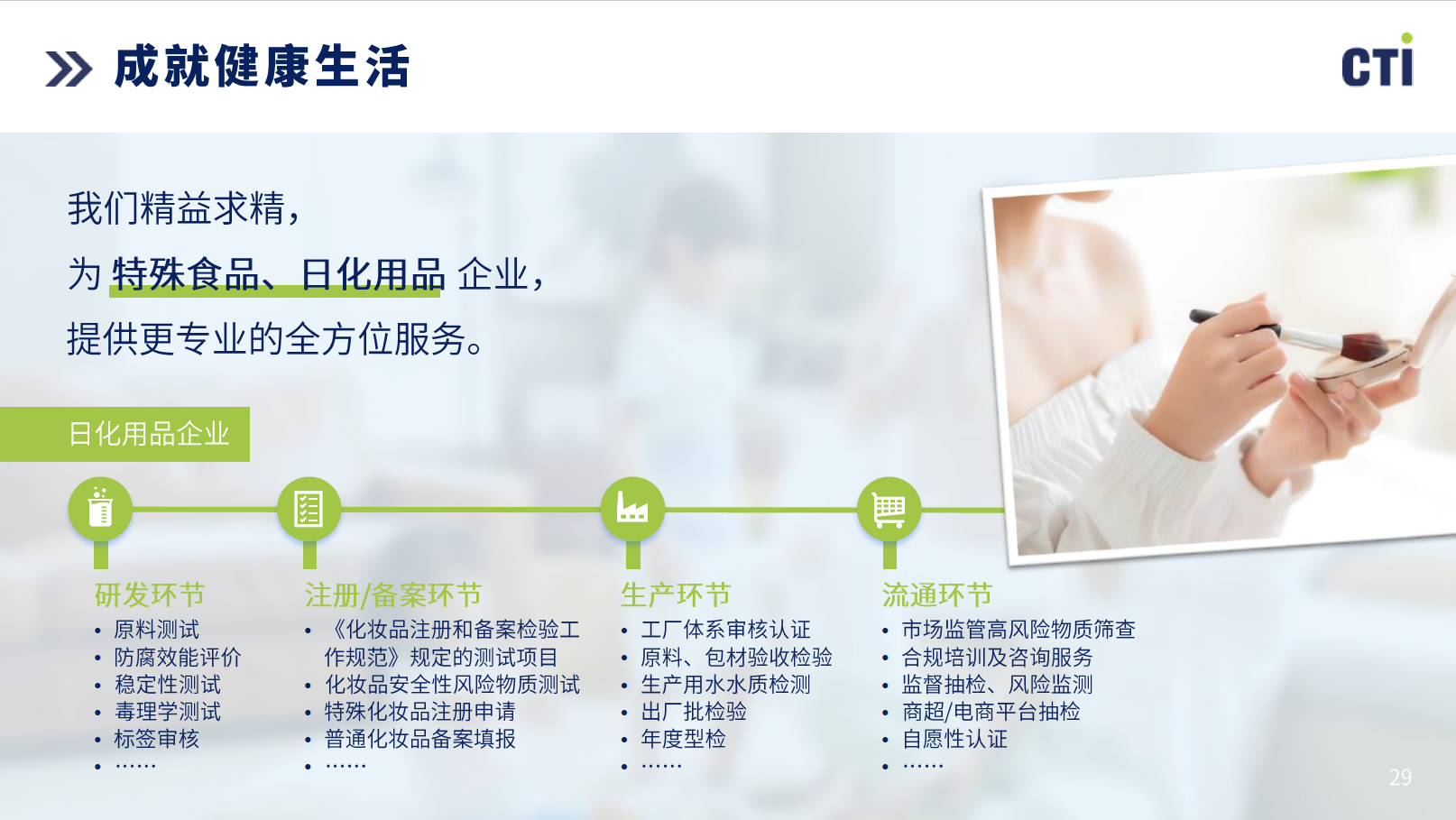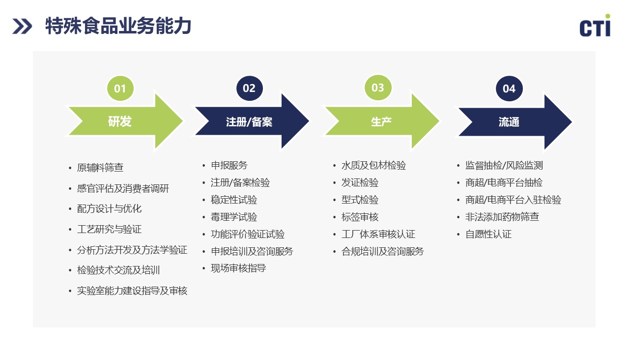CTI华测检测为化妆品、日化用品、保健食品、特医食品等大健康领域企业提供“研发验证、注册备案、流通上市、生产审核”一站式服务。以国际视野帮助企业打通全环节的合规质量检测,实现产品生命周期的创新管控。我们凭借覆盖全国的实验室网络、双C资质、特殊食品验证评价技术机构 & 化妆品注册备案检验机构资质、完备的监管体系及风险预警数据库、丰富的技术支撑及法规研究团队,已成为上百家知名企业长期可靠的合作伙伴。